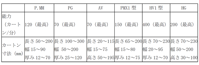 - カートニングする製品の形状、サイズに広範囲に対応するために多くの機種が品揃えされている。