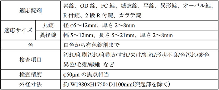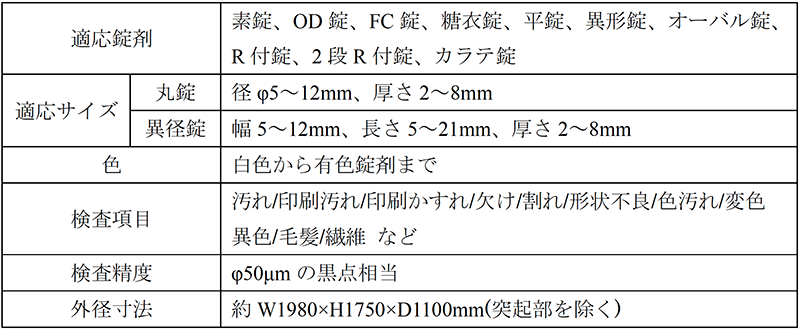 - 錠剤の搬送・外観検査・良/不良選別を1台で行うことが可能な検査装置