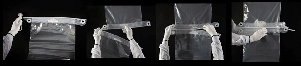 - 粉粒体や錠剤などを封じ込めて、外気に触れることなく移送(投入/排出)することが可能なシングルユースのZip式バッグ。