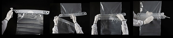 - 単に移送用のみではなく、グローブ付きのFlecoZipバッグや洗浄ノズル付バック等のオプションパーツでインラインサンプリング、洗浄、エアレーションが可能。