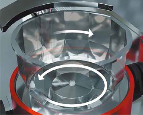- 容器の上部(ドラム)と下部(ディスク)がそれぞれ独立回転し、処理対象物全体が渦巻き状に流動する。ドラムとディスクは回転方向と回転数を処理方法に合わせて制御可能。