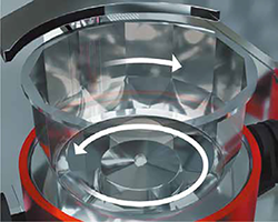 - すばやく仕上げる遠心転動型モードから、やさしく仕上げるパン型モードへ移行し、その逆も可能。