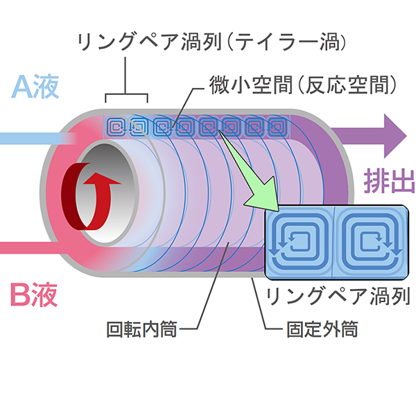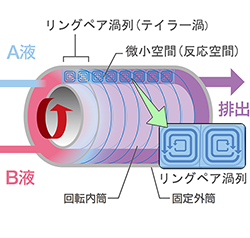 - テイラー渦とは、固定外筒と回転内筒の微小空間(反応空間)に流体を供給し、内筒を回転したときに生じる渦流のことをいう。