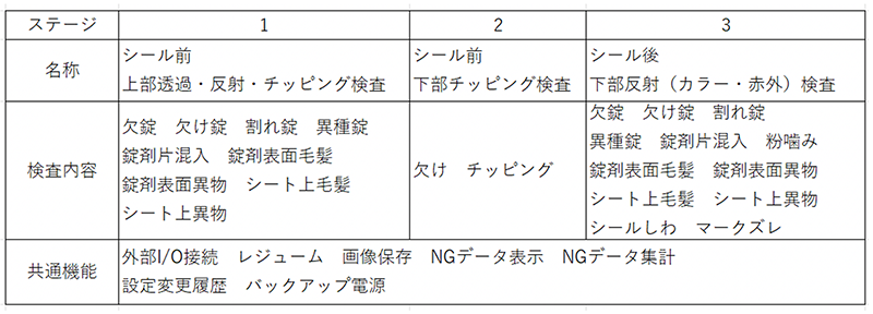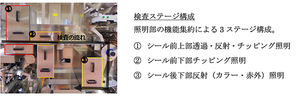 【装置の特徴】- 従来では照明種別ごとに独立していた検査ステージを6ステージから3ステージに集約し、省スペース化を実現