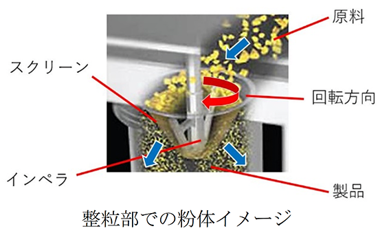 - 原料は、インペラ(回転羽根)によって起こされた渦巻流と遠心力でスクリーンとインペラの間の整粒作用域へと連続的に供給され、解砕・粉砕されスクリーンの開口部から瞬時に排出。